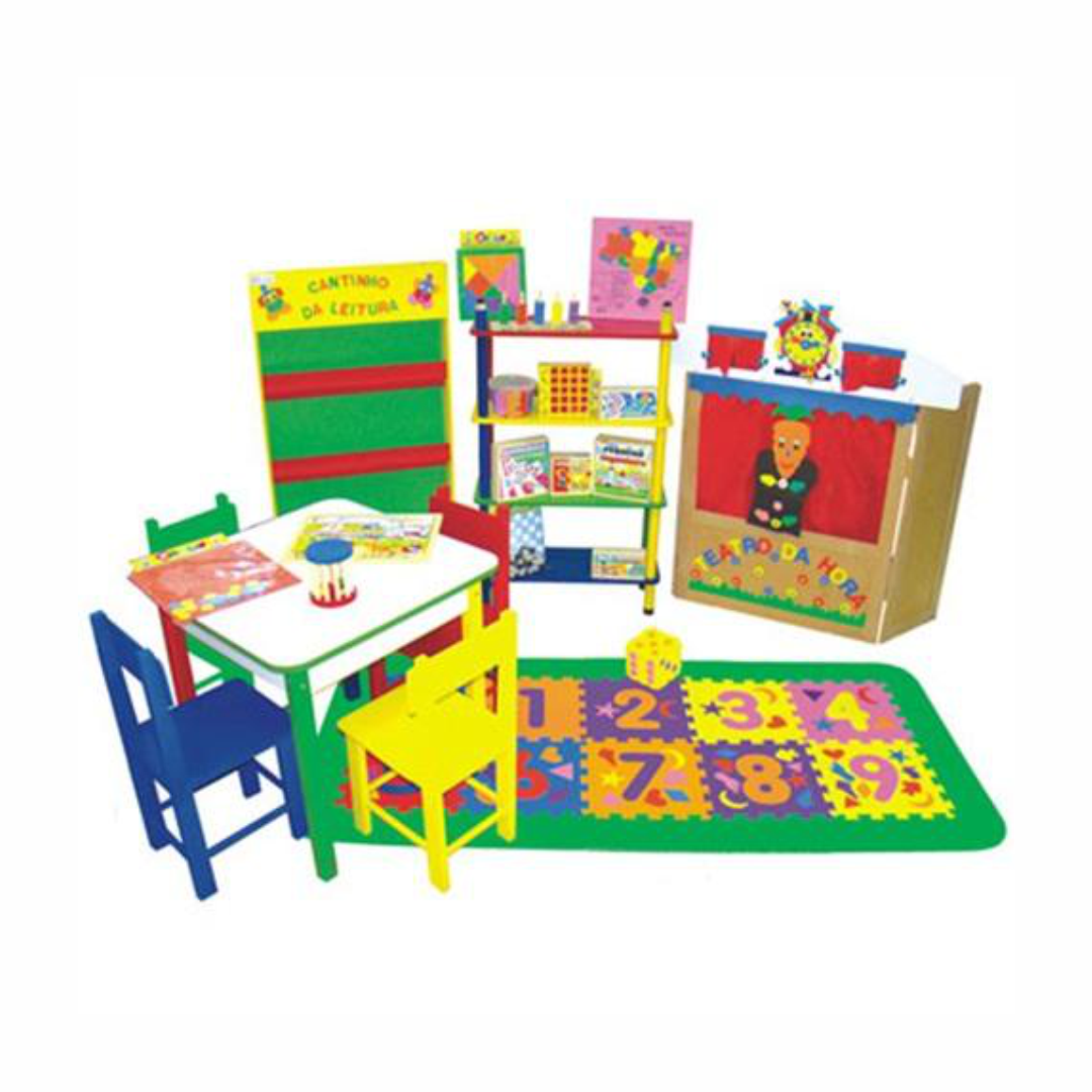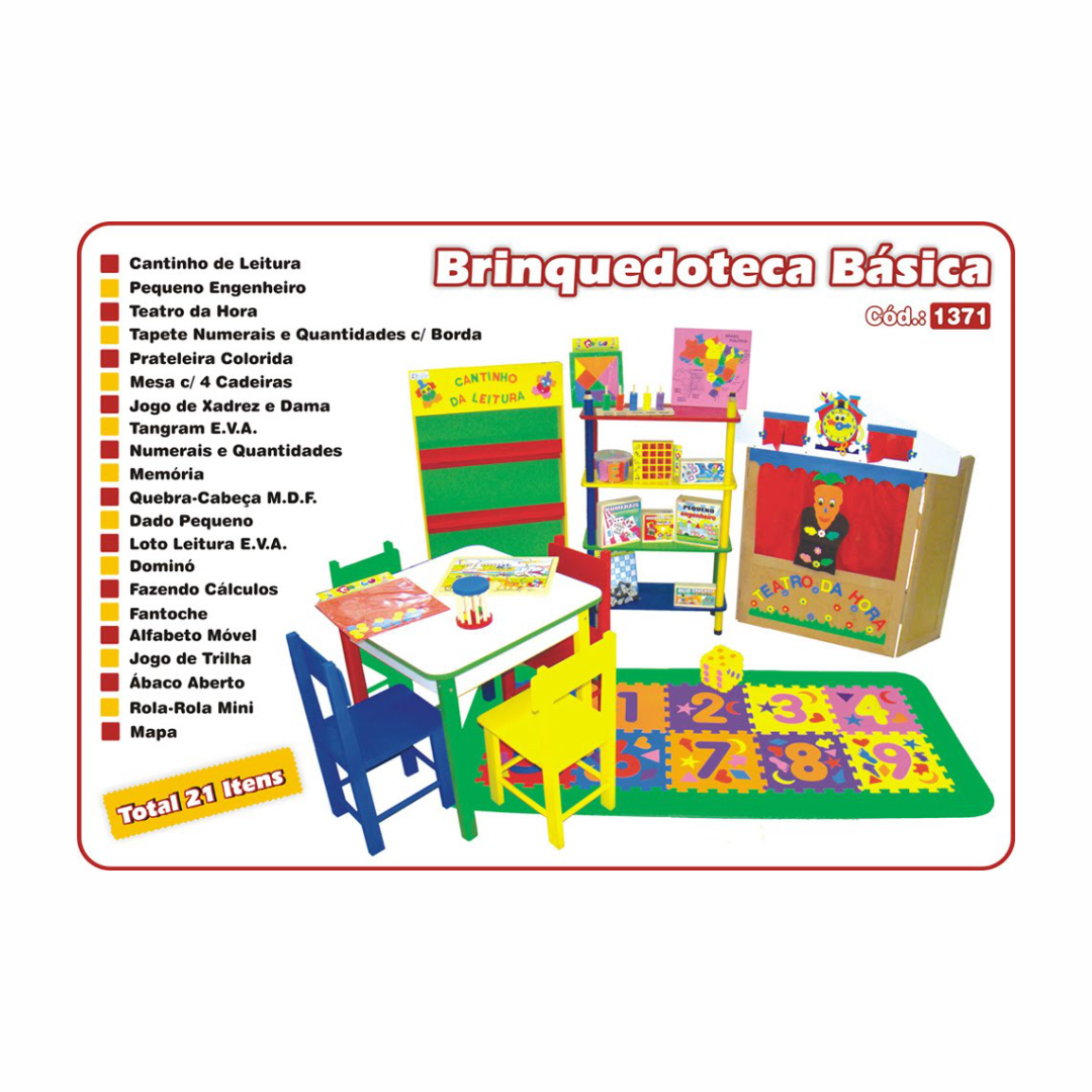 - Brinquedoteca composta por 21 itens: Cantinho da leitura; Teatro da hora; Tapetes numerais e quantidades com borda; Mesa de fórmica com 4 cadeiras; Prateleira colorida; Mapa; Fantoche; Pequeno engenheiro; Tangram E.V.A.; Dominó; Memória; Quebra-cabeça de M.D.F.; Dado pequeno; Loto leitura E.V.A.; Numerais e quantidades; Fazendo cálculos; Jogo xadrez e dama; Alfabeto móvel; Jogo de trilha; Ábaco aberto; Rola-rola mini. Produto com certificação do INMETRO;