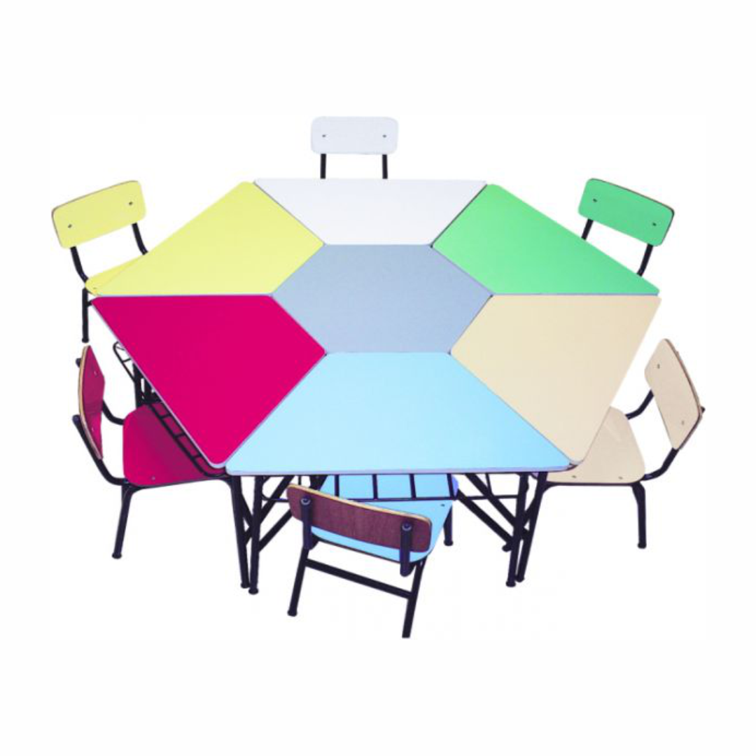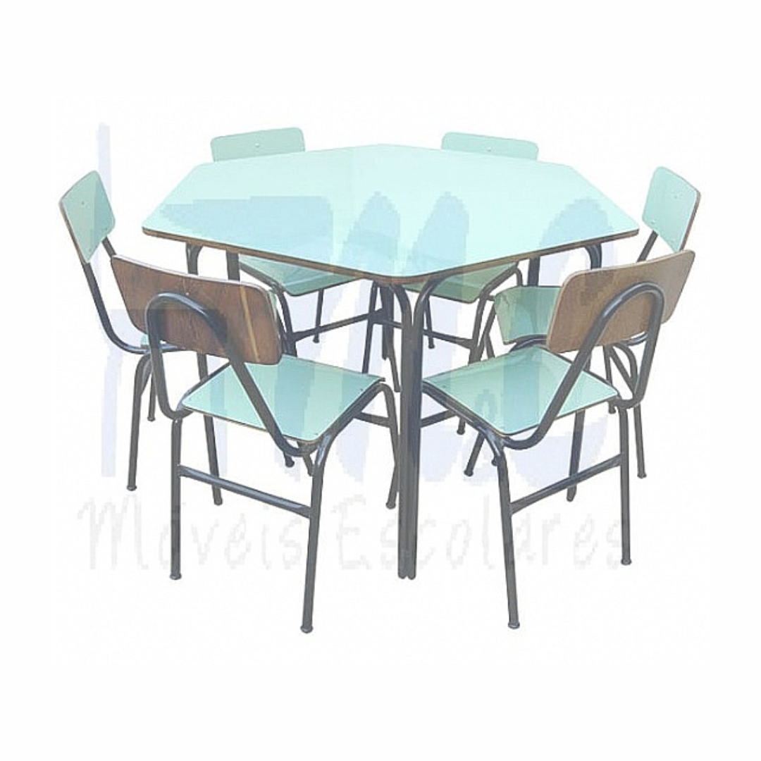 Conjunto escolar sextavado 6 lugares sendo 01 mesa com tampo em mdf 18mm mdf:1,10×1,10 revestido em PVC com bordas arredondadas estrutura em tubo de aço 20×40 pintada com tinta epóxi a pó. 06 Cadeiras assento e encosto confeccionado em compensado multilaminado boleado e anatômico. Medida do assento 31x30cm e encosto 30x16cm. Estrutura em tubo de aço 7/8 pés duplos. Pintada com tinta epoxi a pó. Altura total da mesa infantil 55cm. Altura total da mesa adulto 79cm.