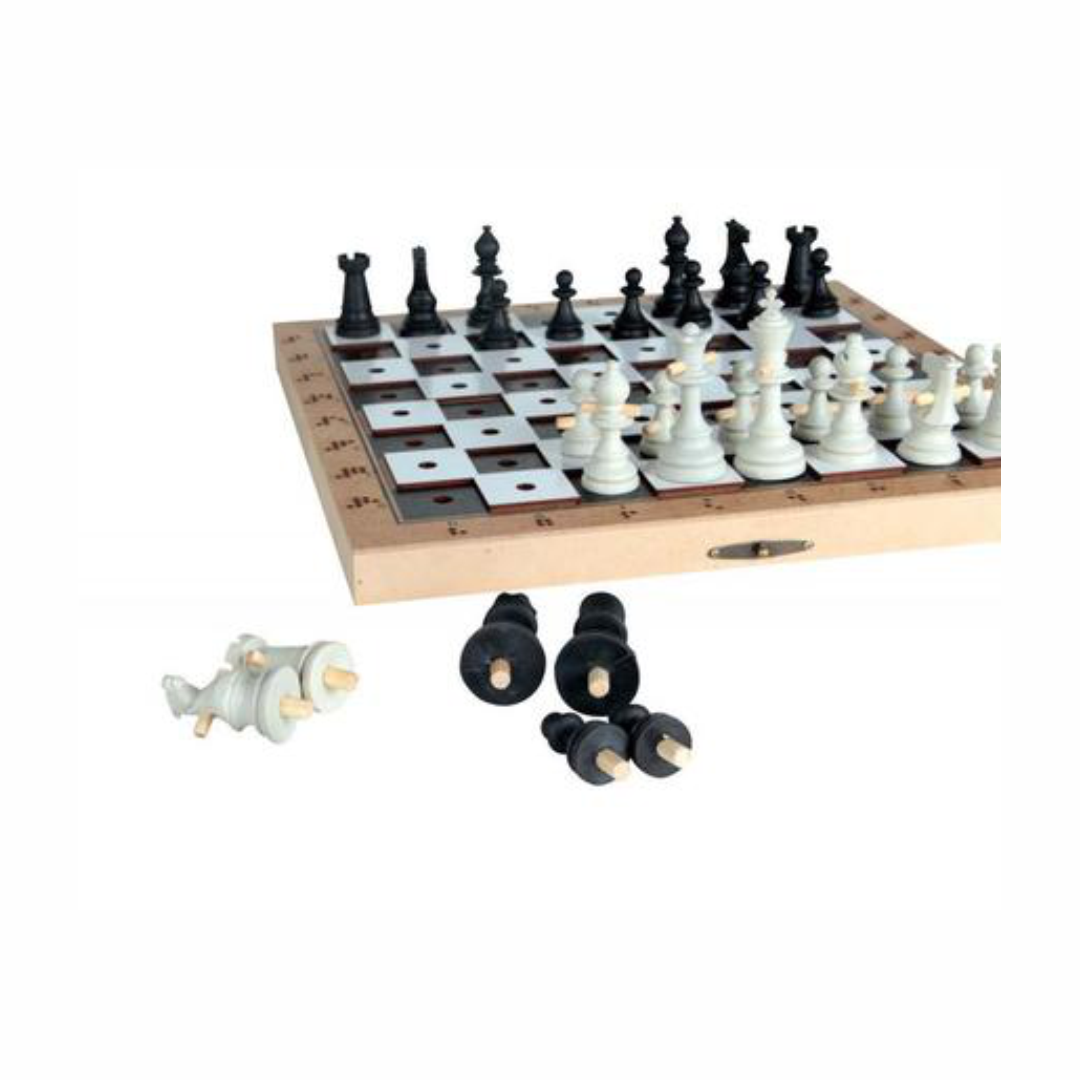 • Tabuleiro estojo adaptado no sistema Braille. Letras e números do sistema Braille são representados em forma de relevo. Possui orifícios para encaixe das peças com cavilhas. Total 32 peças.
