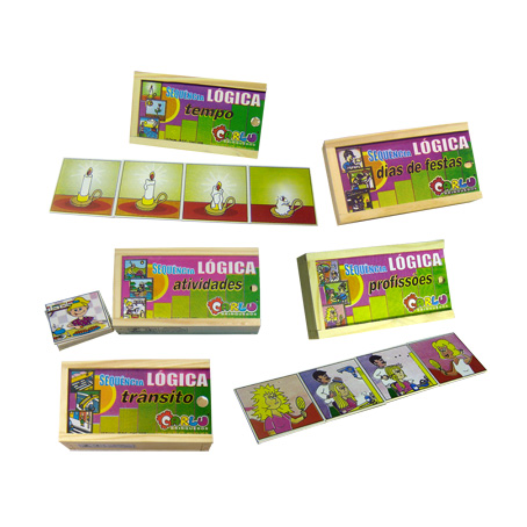 - Jogos confeccionados em madeira e M.D.F., peças pintadas com fundo branco ultravioleta atóxico e serigrafadas em policromia com tinta ultravioleta atóxica em uma das faces, sendo 16 peças de 7 x 7 cm representando as sequências e os momentos de cada um em figuras. Tampa: Face externa pintada com fundo branco ultravioleta atóxico, serigrafada em policromia ultravioleta atóxica, com orifício de 1 cm para facilitar a abertura da caixa. Embalagem: Caixa de madeira (com encaixe de correr) medindo 17 x 9,5 x 4,5 cm. Lacrada com película de P.V.C. encolhível. Produto com certificação do INMETRO;
